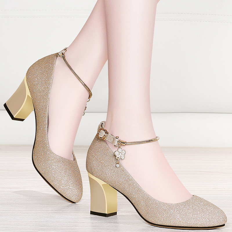 2026春季新款金色皮鞋女士高跟鞋夏季粗跟单鞋韩版尖头百搭工作鞋