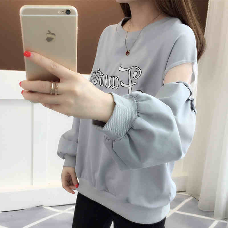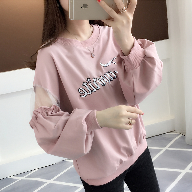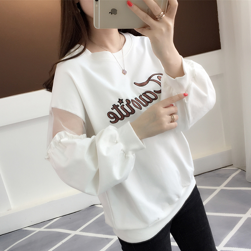 > 春装新款卫衣 韩版女装网纱拼接长袖T恤圆领字母印花套头上衣潮女